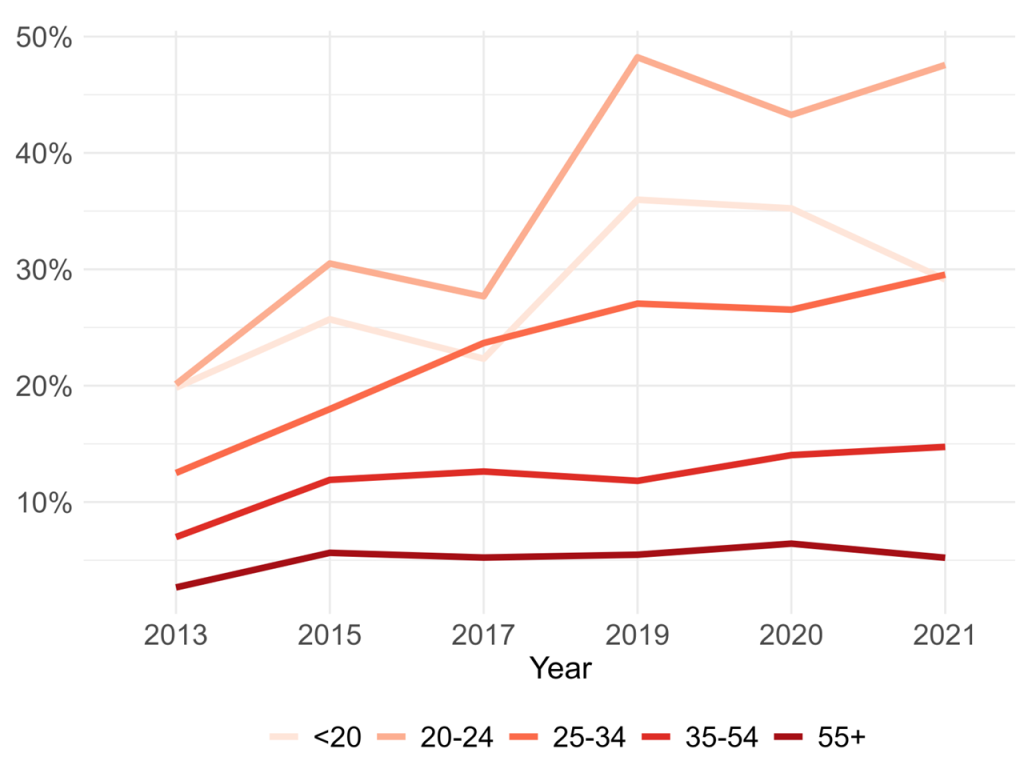 An examination of conventional cigarette use across the Provinces suggests a degree of discordance between e-cigarette use and conventional smoking. Quebec, which has higher smoking rates than the national average (15.7% for past 30-day use based on our estimates and 12.2% from the 2020-2021 Canadian Tobacco and Nicotine Survey), features lower vaping rates than nine other Provinces in our dataset. We estimated the vaping prevalence to be 3.7% across the study period. The province where past-month ENDS use is highest – New Brunswick (5.6%) – has a similar rate of conventional smoking as Quebec, but was among the lowest for prevalence of current ENDS use in this evaluation (Figure 3). This comparison does not account for the intensity of one’s use of either product. Different patterns may be revealed along dimensions of use intensity, including cigarettes consumed per day among smokers or analogous measures of ENDS use intensity.