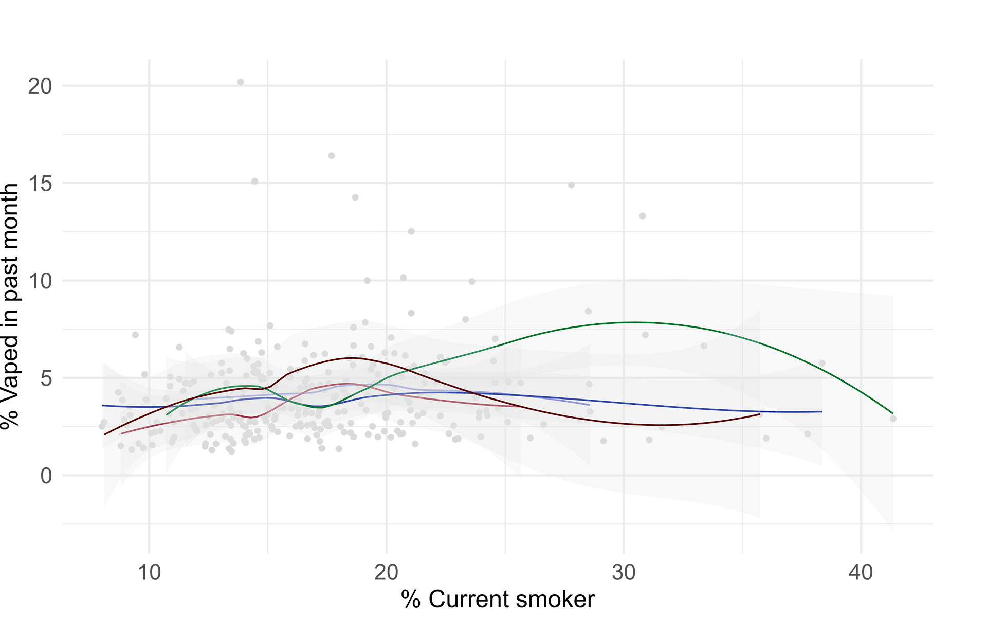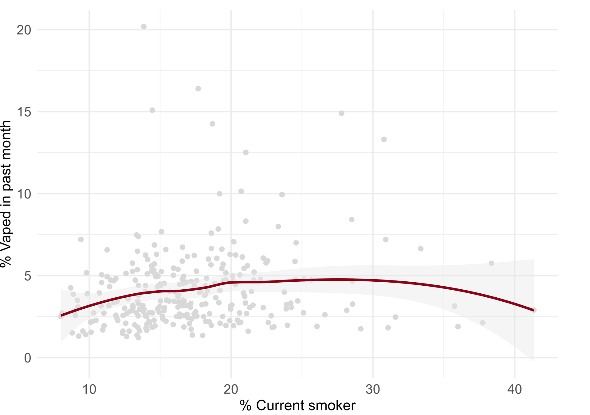 To illustrate these patterns differently, we look at the relationship between conventional smoking and e-cigarette use across 282 CDs in our dataset. The major finding is that there was only modest concordance between smoking and vaping (Figure 8).