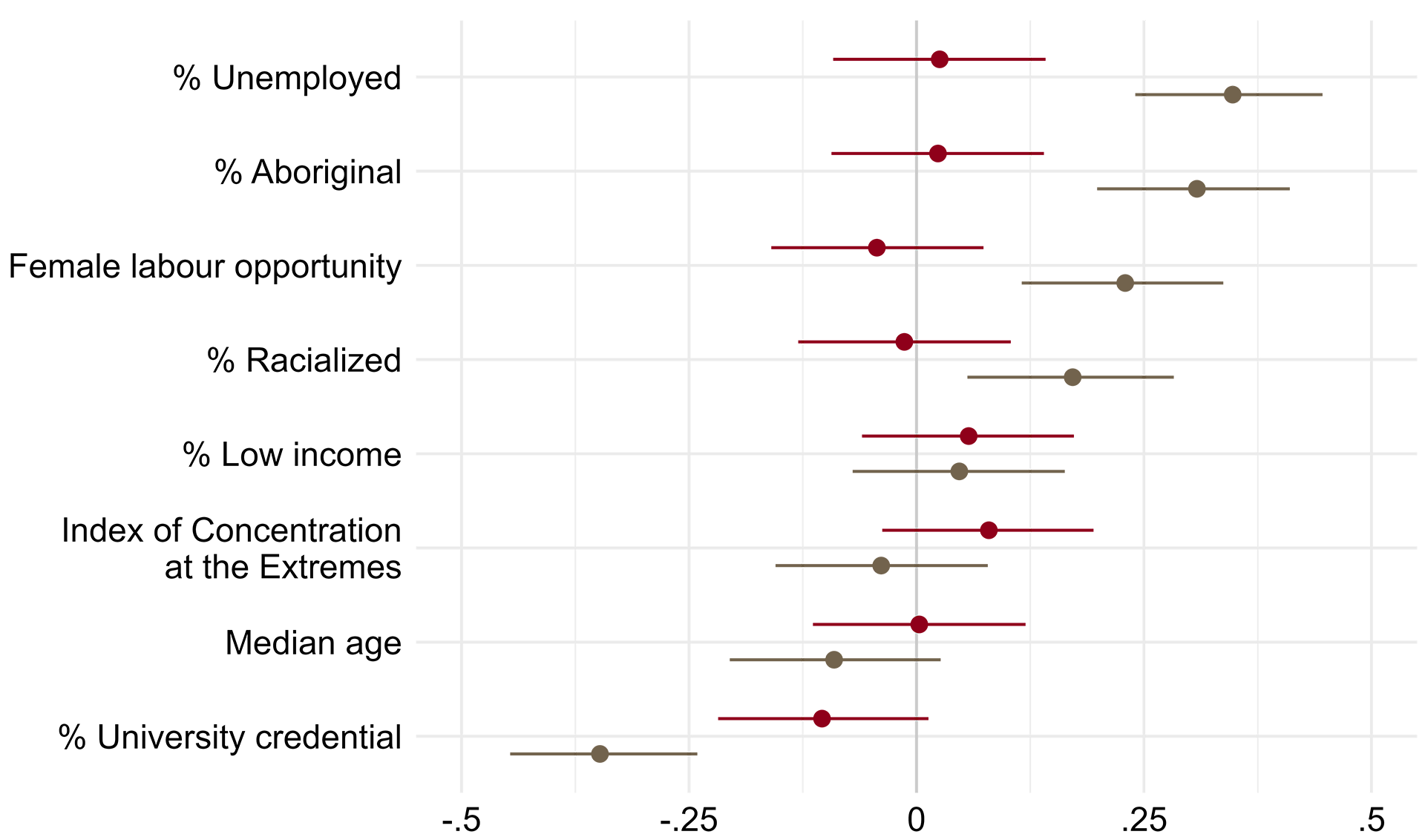 We use bivariate correlations (Figure 10) to assess associations between electronic and conventional cigarette usage and CD-level demographic and socioeconomic correlates. Across CDs, certain demographic characteristics were associated with higher rates of conventional smoking but not vaping, including higher unemployment, a greater proportion of indigenous and racialized persons, and increased female labour opportunities. In contrast, smoking rates were significantly lower in CDs with a greater share of the population with university degrees. Electronic cigarette use prevalence was also moderately inversely correlated with the proportion of individuals with university degrees, although the other characteristics were not associated with e-cigarette use.