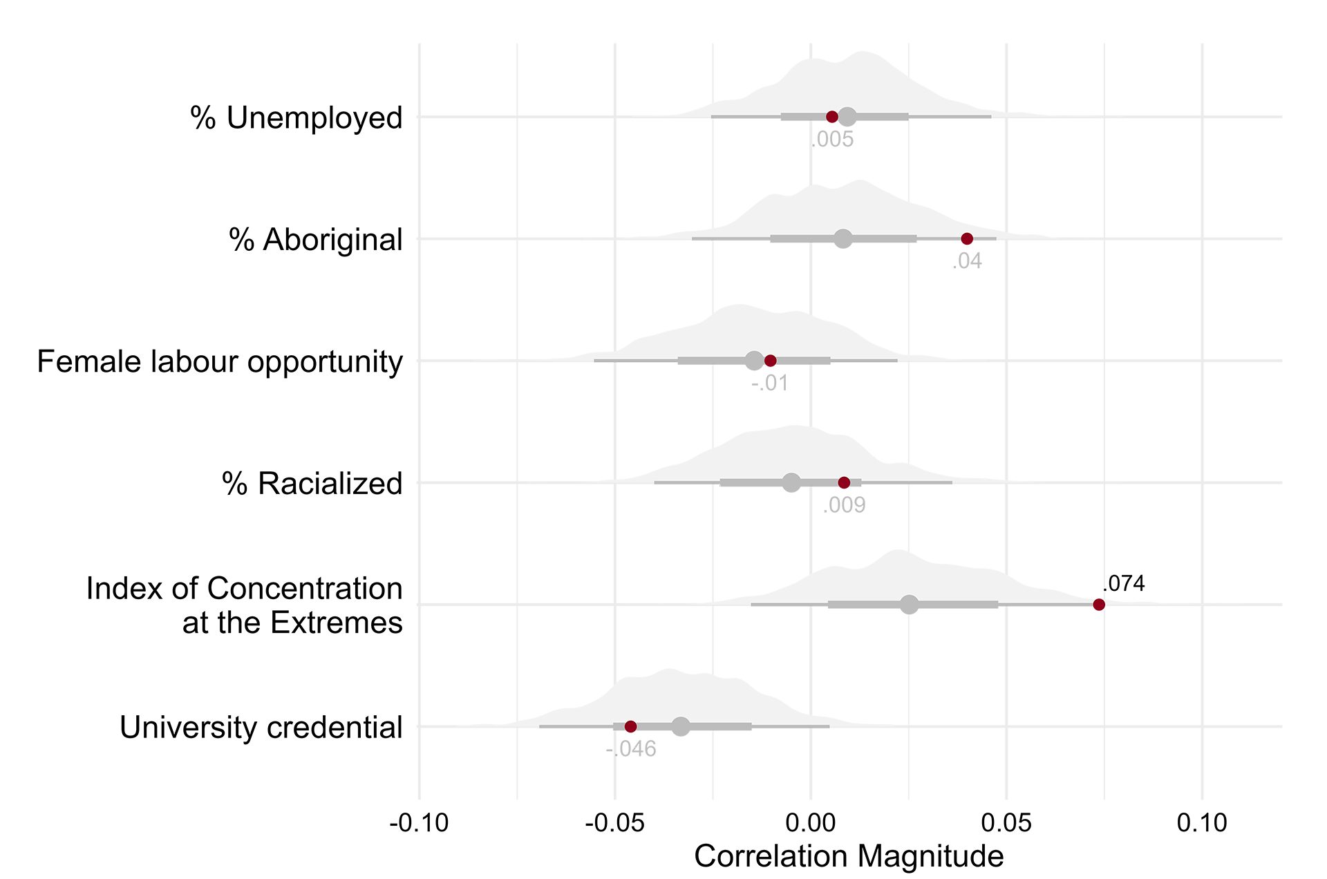 where wij is a row-standardized spatial weight for every ith Census Division in each jth network of nearby Census Divisions. This equation is essentially an amalgam of Pearson’s r and Moran’s I statistics to produce LX,Y – a measure of both bivariate correlation and spatial autocorrelation ranging from -1 (indicating an inverse relationship between two variables) to +1 (indicating a positive relationship).